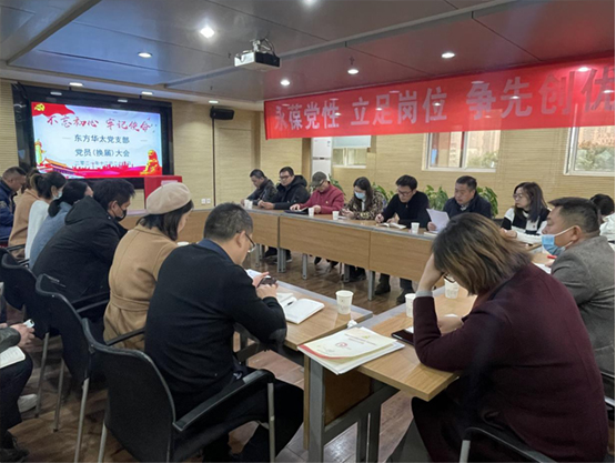 2021 年 12 月 24 日,東方華太黨支部黨員(換屆)大會暨 12 月份支部主題黨日集體學習會議在公司 309 會議室順利召開。大會主題為“永葆黨性、立足崗位、爭先創優”上級黨工委江漢二橋街道黨工委指派黨建指導員一行兩人和公司總經理蒞臨到會指導。